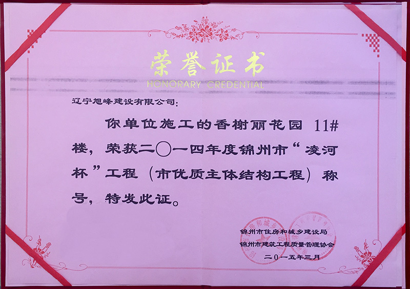 锦州市凌河杯结构优质工程——香榭丽花园11#楼-荣誉-旭峰建设有限公司